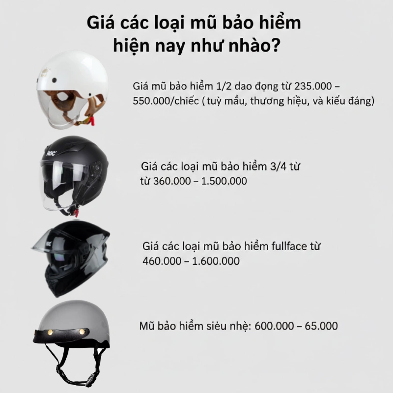 Giá các loại mũ bảo hiểm hiện nay không có một con số cố định, mà dao động khá rộng. Tùy theo loại mũ, chất liệu, thương hiệu, tiêu chuẩn an toàn và mục đích sử dụng. Dưới đây là bức tranh tổng quan, dễ hiểu và sát với thị trường Việt Nam hiện nay để bạn hình dung và lựa chọn đúng.