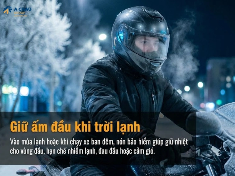 Vào mùa lạnh hoặc khi chạy xe ban đêm, nón bảo hiểm giúp giữ nhiệt cho vùng đầu, hạn chế nhiễm lạnh, đau đầu hoặc cảm gió.