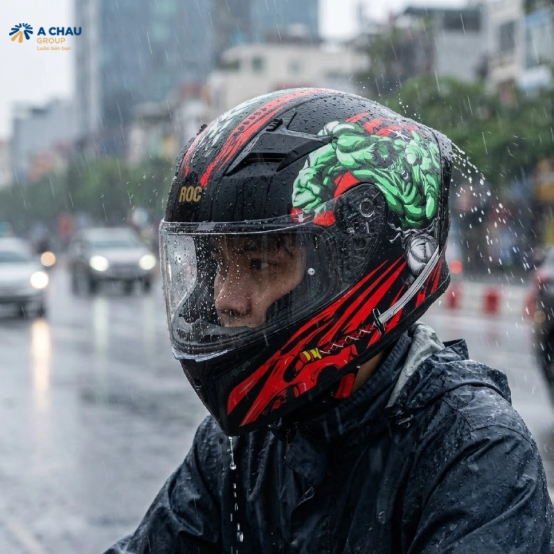 Nón bảo hiểm có kính giúp che mưa, tránh nước mưa tạt thẳng vào mặt, đặc biệt hữu ích khi di chuyển trong thời tiết xấu.
