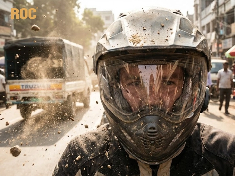 Bụi mịn, côn trùng, cát, sỏi bay trên đường đều có thể gây nguy hiểm nếu bay vào mắt. Khi di chuyển trên đường, đặc biệt là quốc lộ hoặc công trình đang thi công, bụi và sỏi đá là “kẻ thù” nguy hiểm. Lúc này đội mũ bảo hiểm có kính là giải pháp tuyệt vời nhất. Và đây cũng alf 1 trong 20 công dụng của nón bảo hiểm thiết thực nhất.