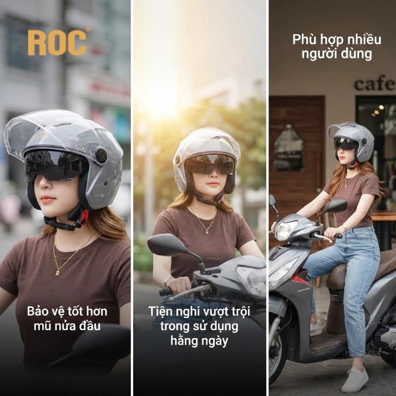 ROC R10 là mẫu mũ 3/4 2 kính được đánh giá cao nhờ sự cân bằng giữa thiết kế, độ thoải mái và tính tiện dụng. Mũ có form gọn, ôm đầu, không tạo cảm giác cồng kềnh khi đội lâu. Hệ thống hai kính của ROC R10 hoạt động mượt, kính râm giúp giảm chói rõ rệt khi đi nắng gắt. Về mặt trải nghiệm, đây là chiếc mũ rất “dễ làm quen”, phù hợp với người đi làm hằng ngày, chạy xe tay ga hoặc xe số trong đô thị.